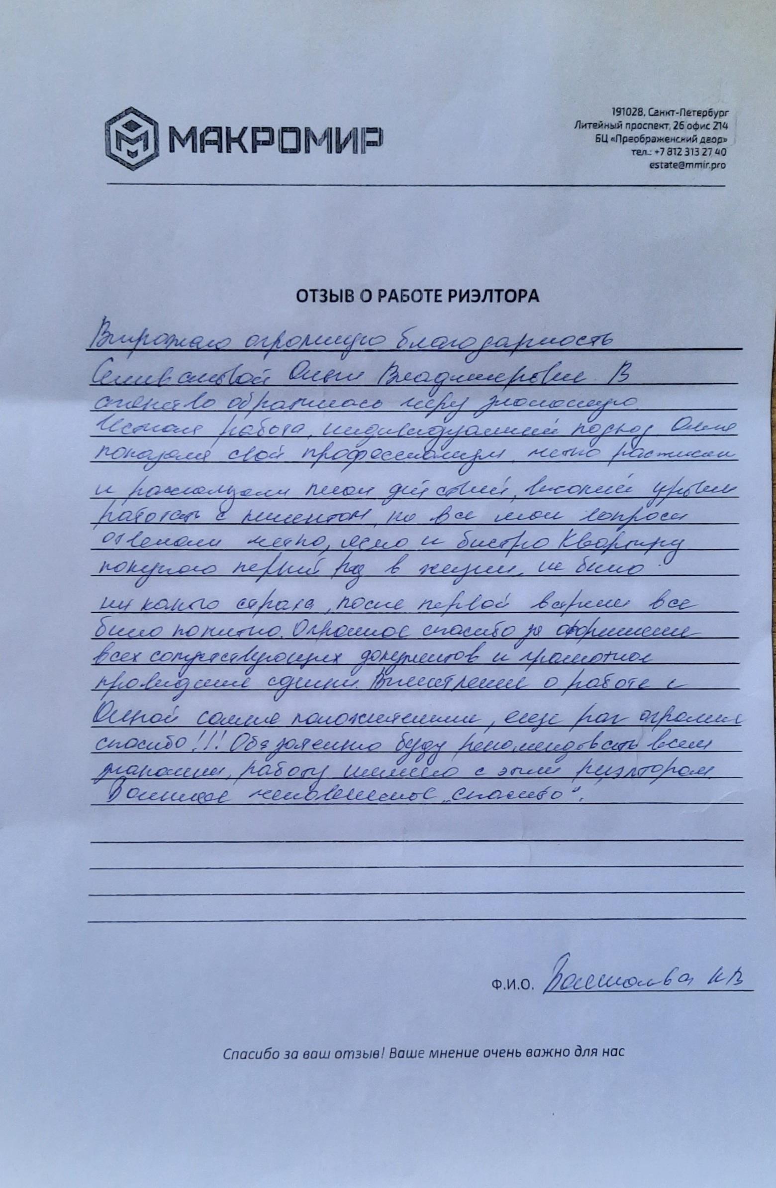 Хочу поблагодарить Ольгу за профессионализм. Квартиру продали всего за пару недель. Все быстро и четко организовала,всегда была на связи,всегда доброжелательна и спокойна. Спасибо, и с праздником 8 Марта)!