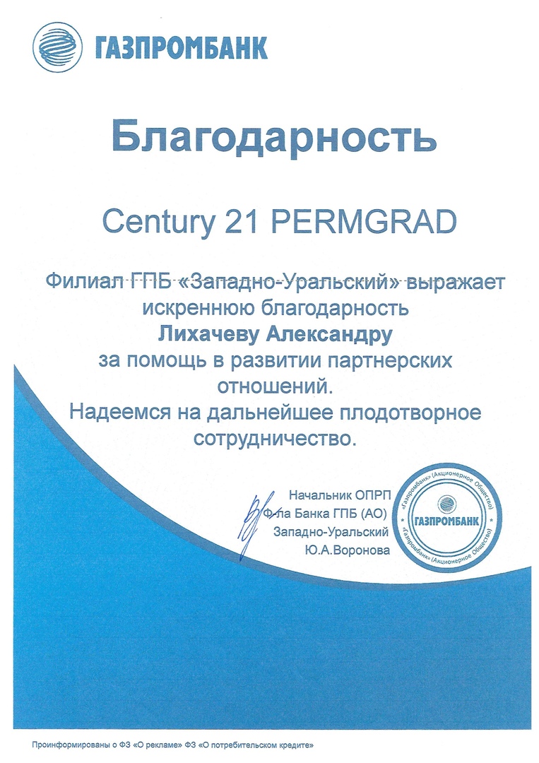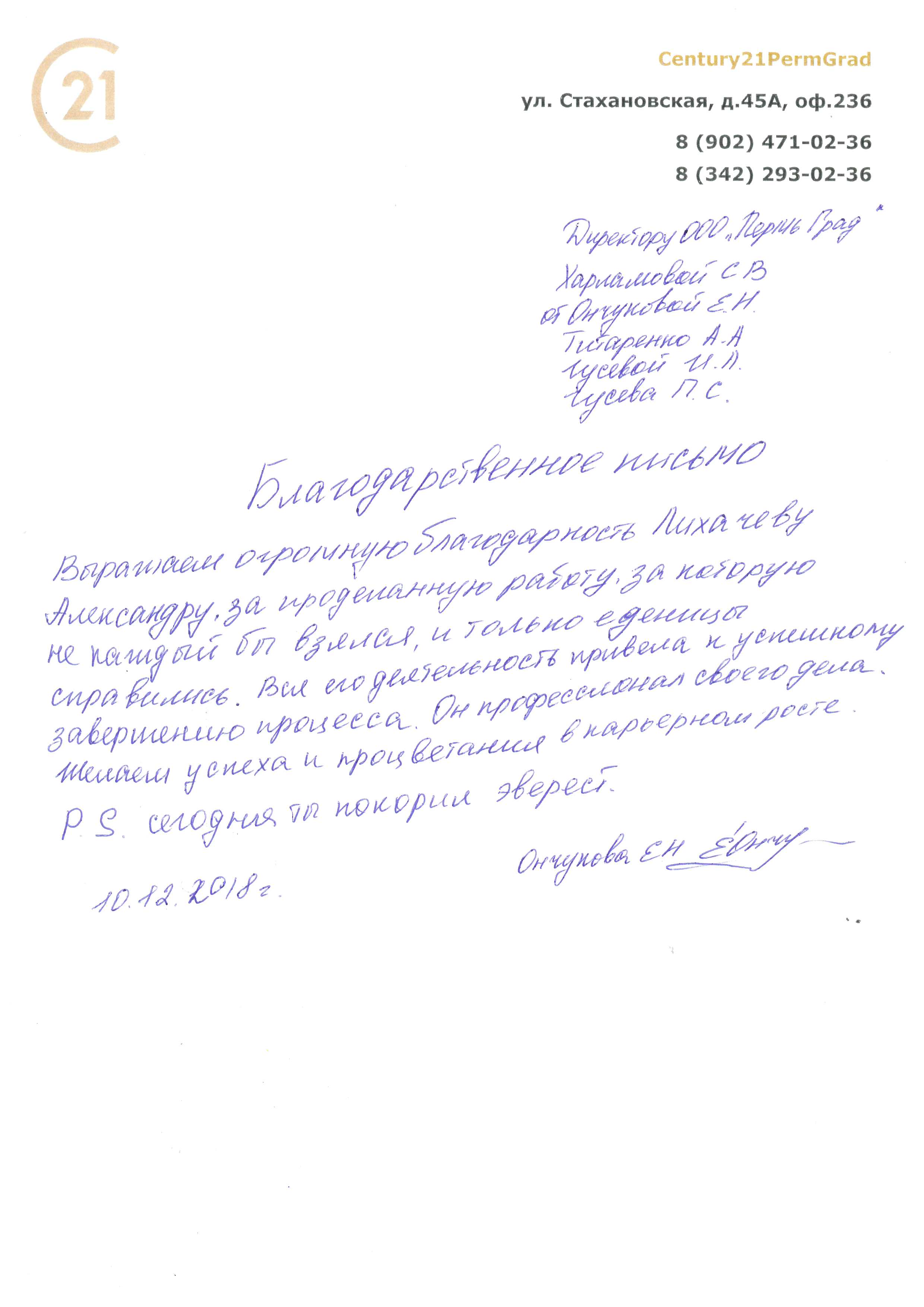 Отзыв... Отзыв? Всего лишь отзыв? Этого мало, чтобы выразить всю благодарность за великолепную работу нашего агента из агентства недвижимости «Century 21», г Пермь, Александра Лихачева при наших двух сделках.