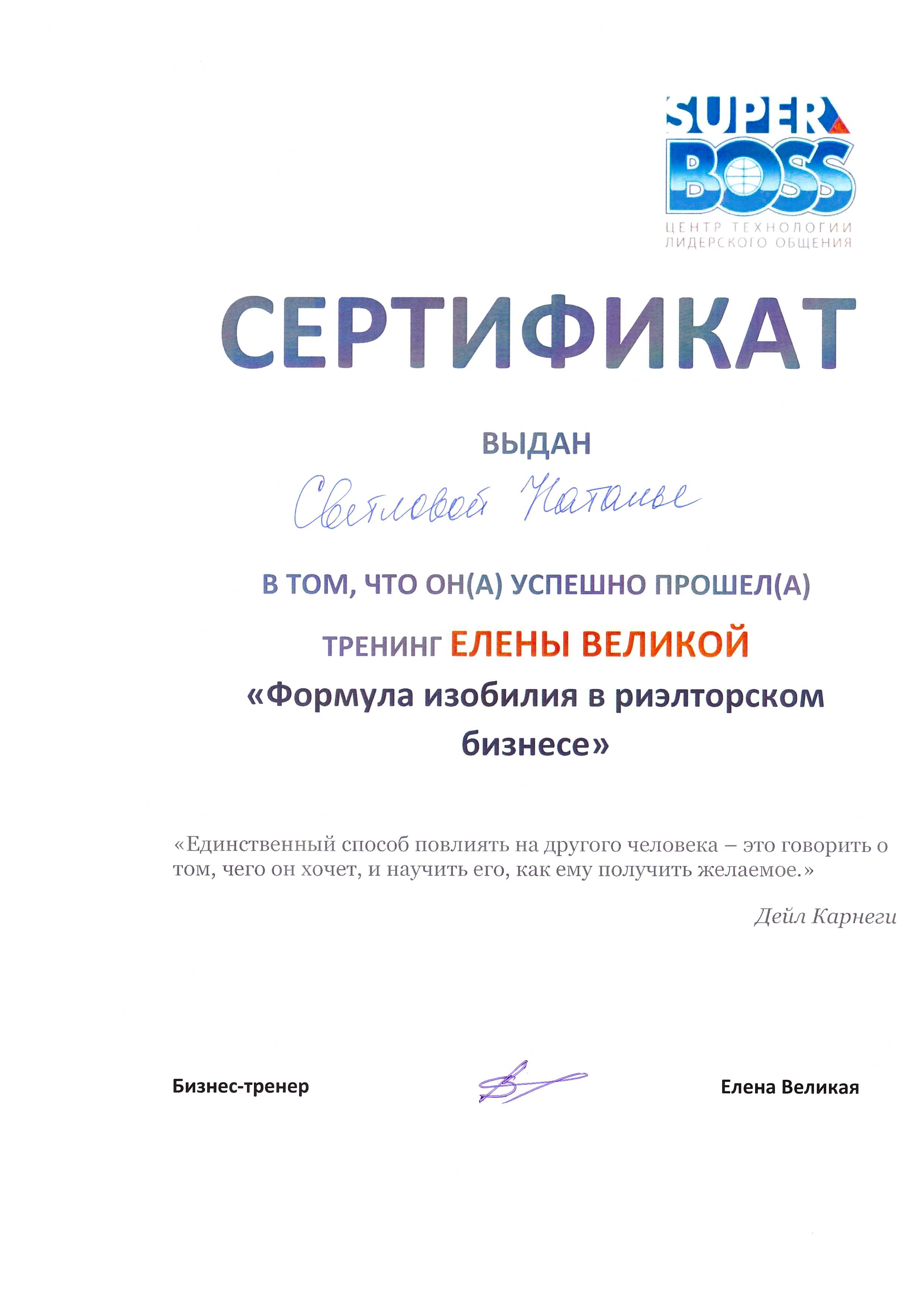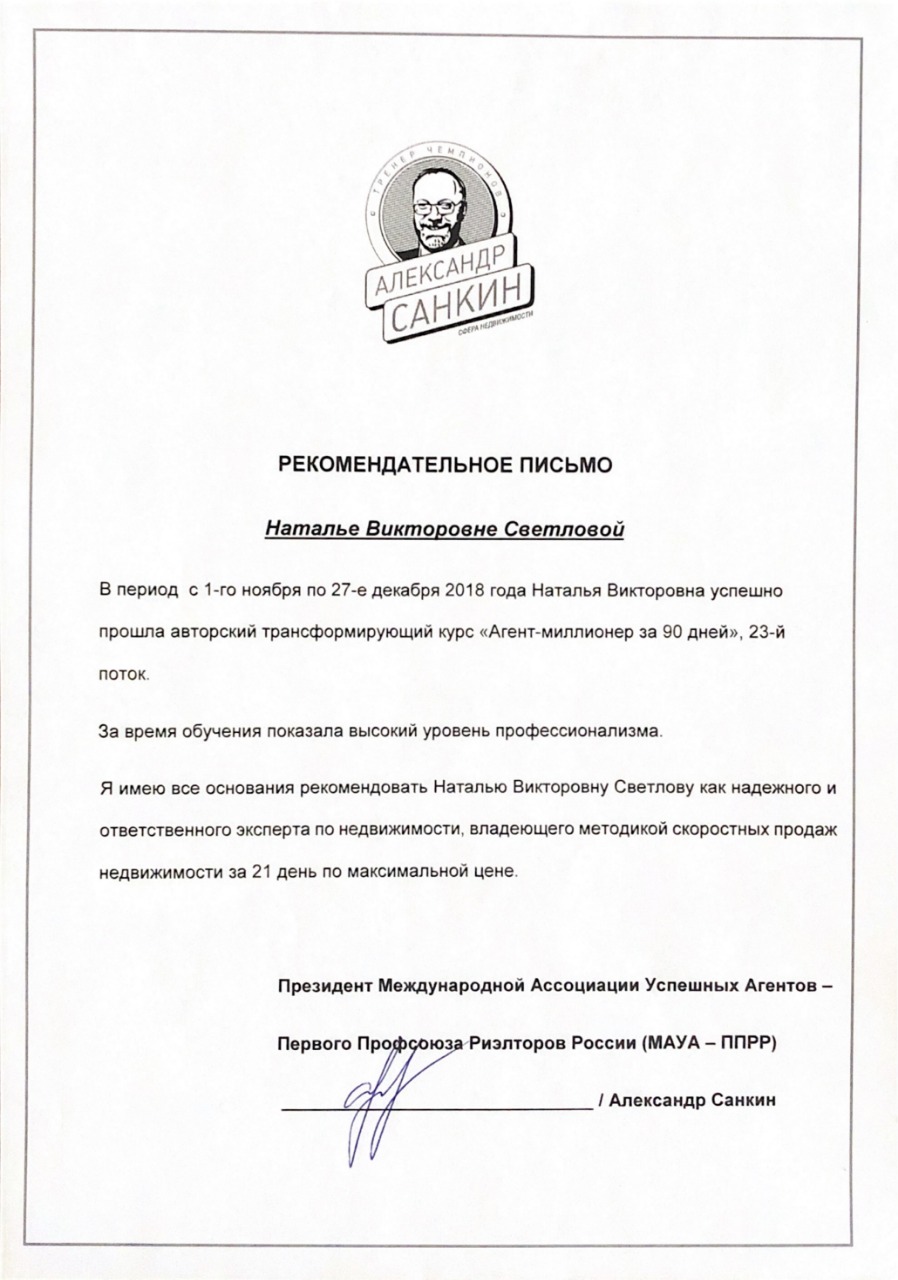Хочу выразить огромную признательность Наталье Светловой. Все было супер профессионально! Реклама сработала на 100%. Продали две квартиры по максимальной цене в течение месяца, успели поймать горящую встречку. Все прошло быстро и надежно. Рекомендую всем. Особенно прислушаться к совету по рекламе.