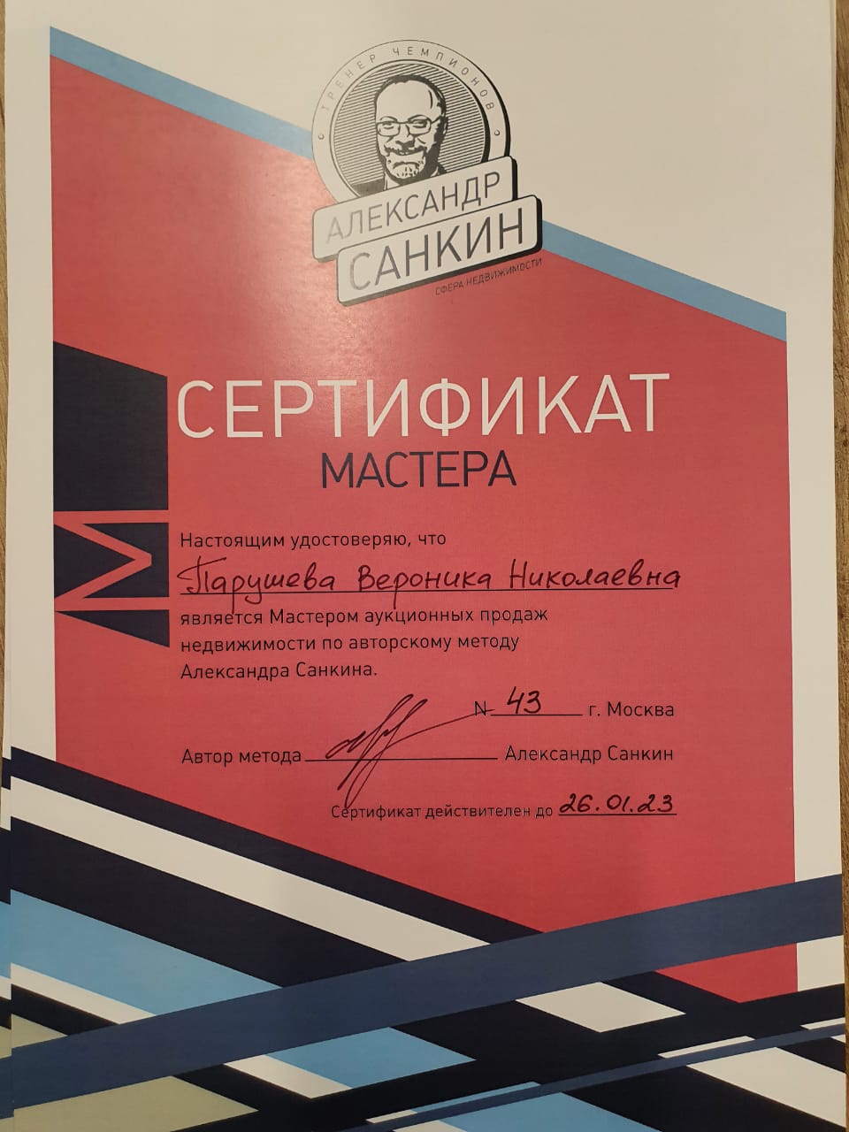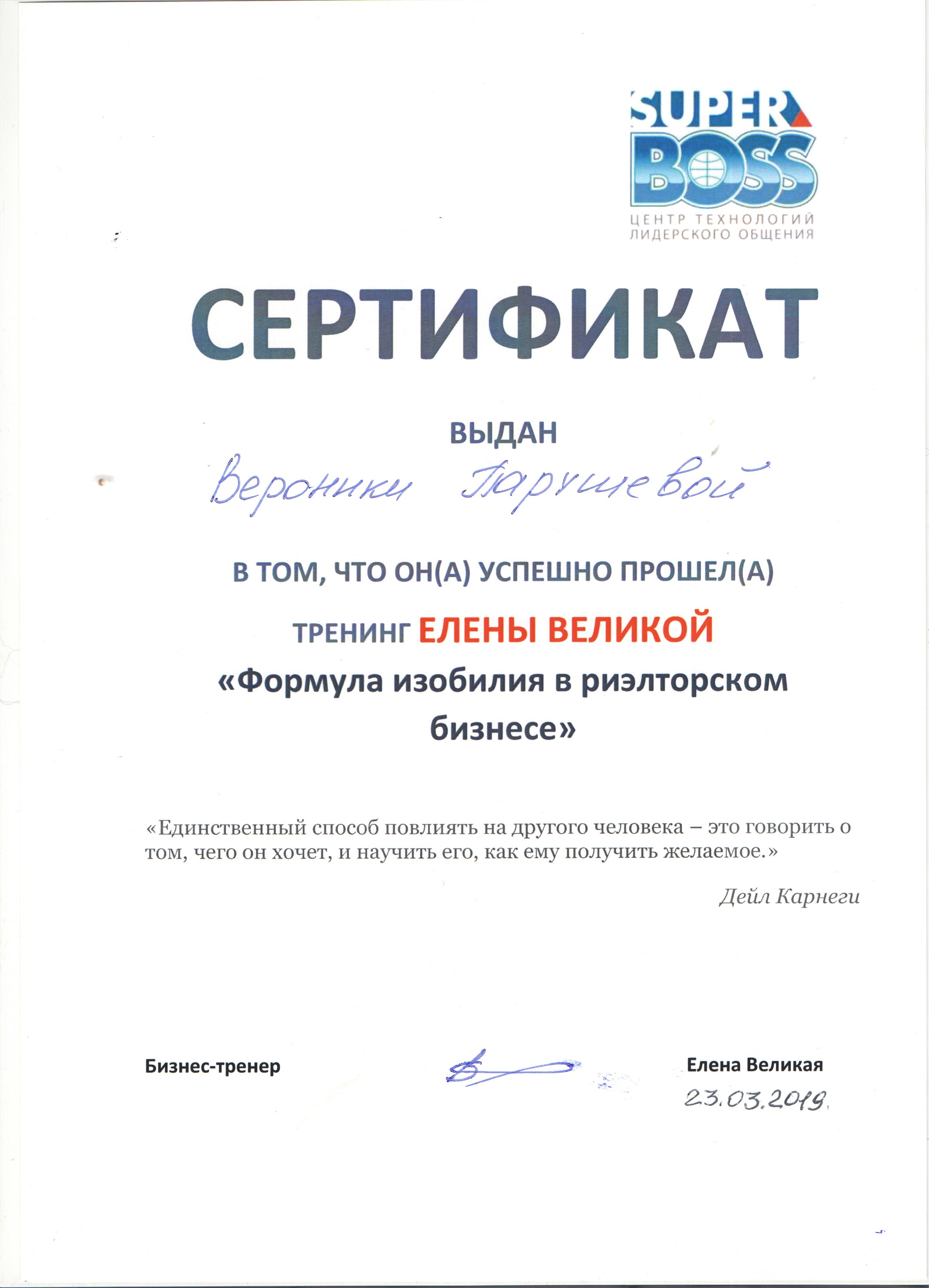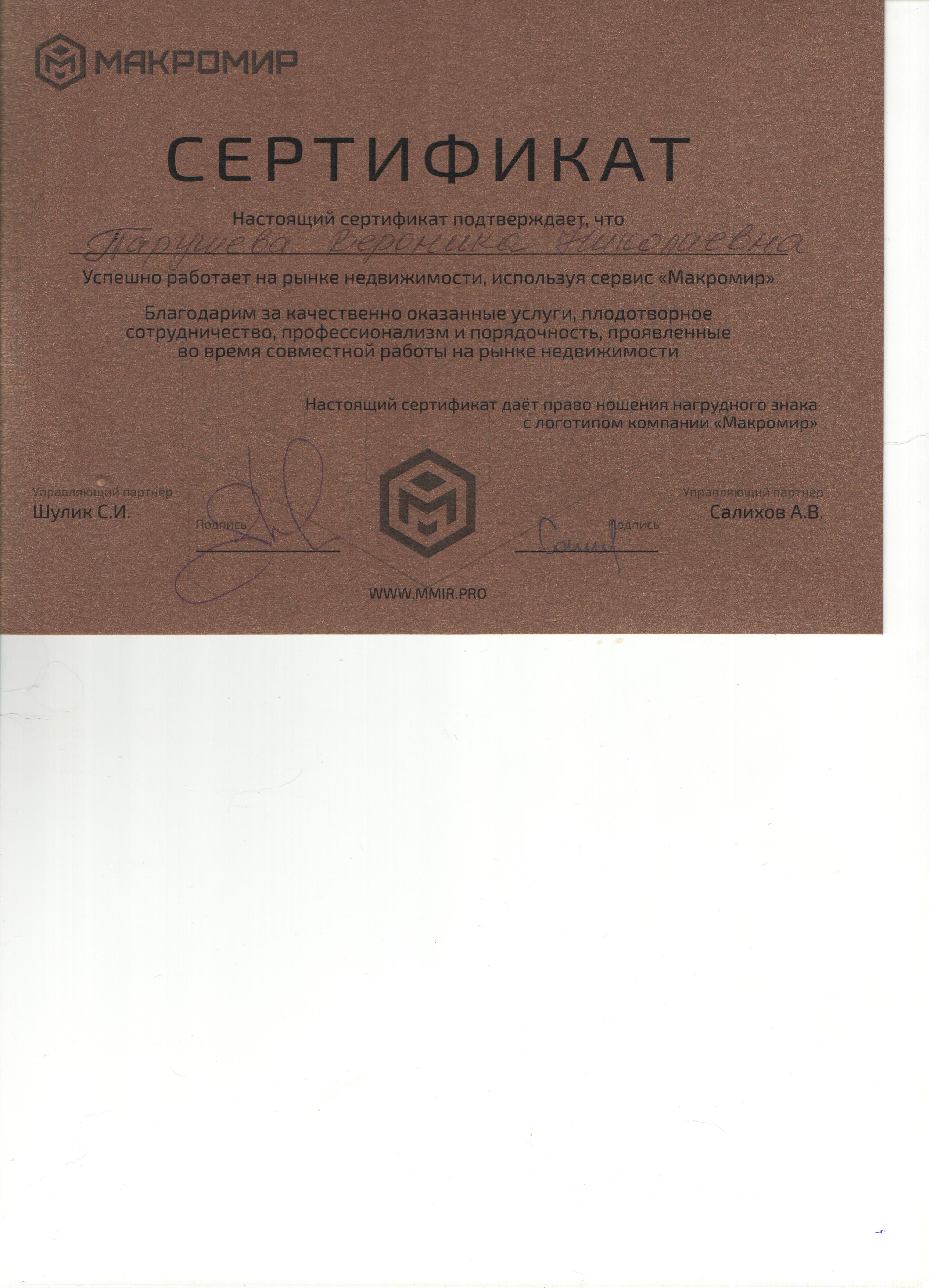 Выражаю благодарность специалисту по недвижимости Парушевой Веронике Николаевне за профессиональную помощь при проведении сделки по продаже и покупке моей квартиры. Вероника Николаевна грамотно и внимательно работает с покупателями, контролирует внесение денежных сумм в банке, проверяет всю документацию. С таким опытным агентом не страшны никакие неожиданные ситуации, связанные с оформлением сделок по недвижимости. Желаю Парушевой В.Н. успехов в работе и всех благ.