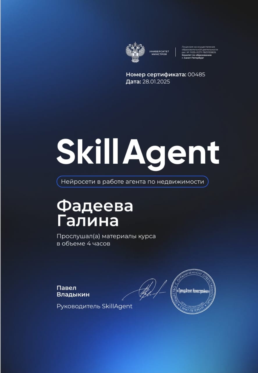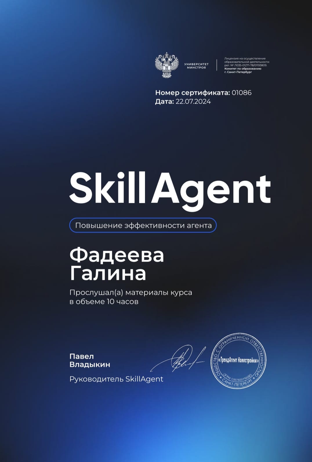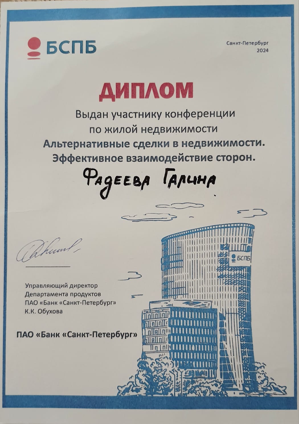 Хочу выразить Галине Фадеевой огромную благодарность за проведение очень сложной сделки, продаже квартиры в другом регионе и приеобретении квартиры в Санкт- Петербурге. На такую сделку способен только юридически грамотный специалист и большим стажем, что очень ценно!