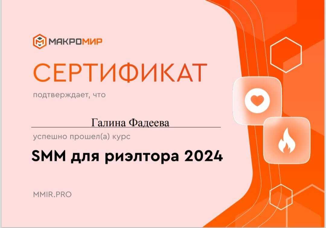 Хочу выразить благодарность Галине Фадеевой за оказание услуг, связанных с приобретением квартиры. Галина - отзывчивый, ответственный, профессиональный специалист своего дела, с которым легко и комфортно работать! Рекомендуем.