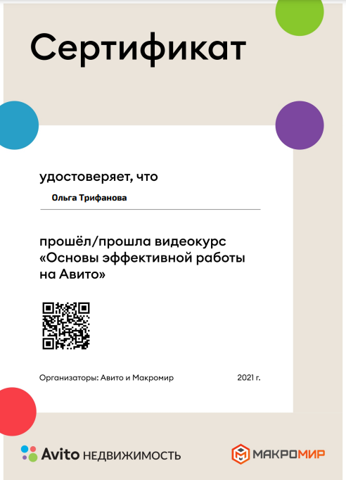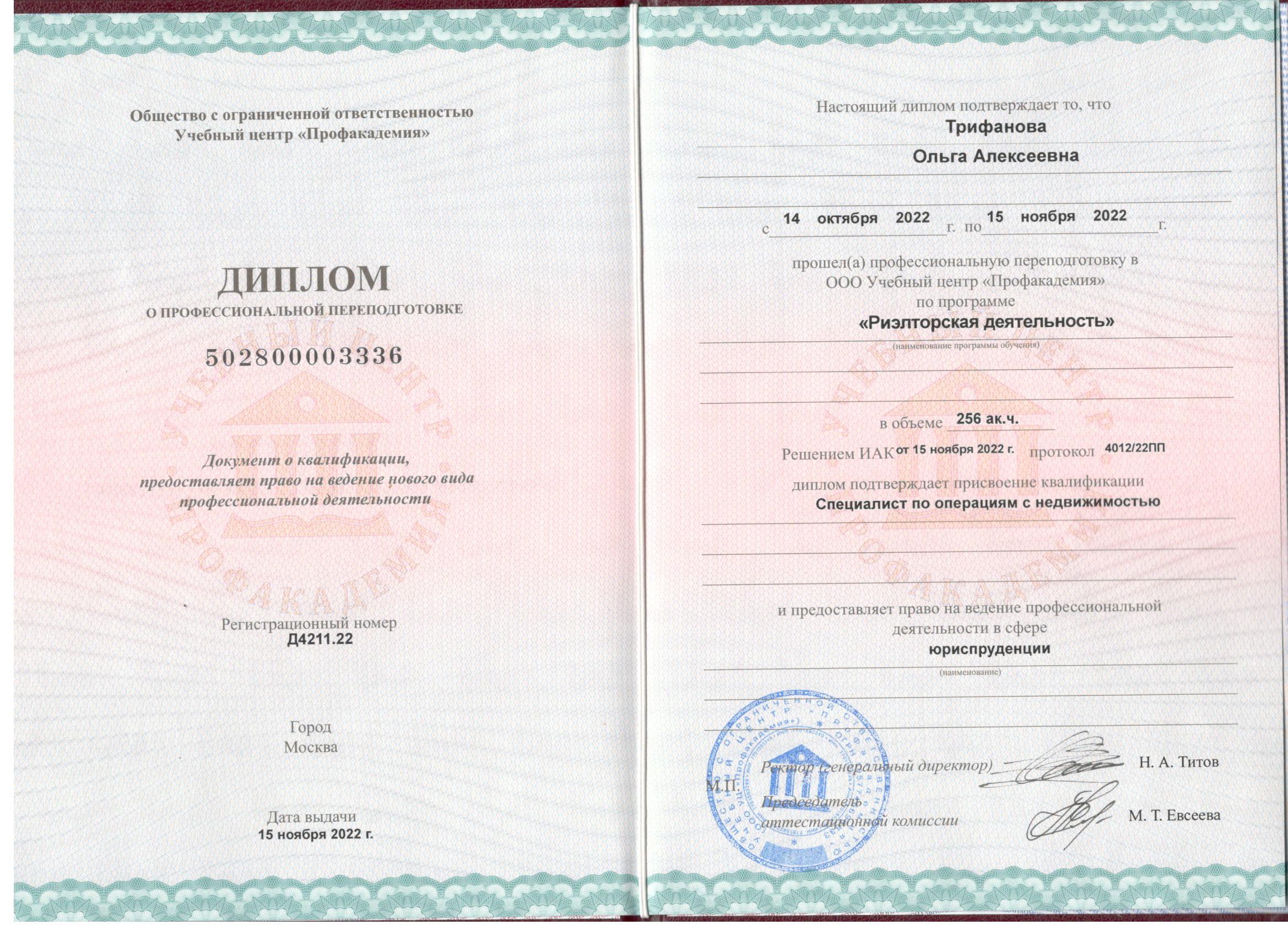Хочется выразить огромную благодарность Ольге Трифоновой за профессионализм в сфере недвижимости. Её грамотный подход приводит к нужному результату. Вежливое и корректное общение с каждым клиентом, грамотный подход, предвидит на перед возможные трудности и на ранних стадиях находит решение. время Рекомендую, замечательный специалист и просто хороший человек.