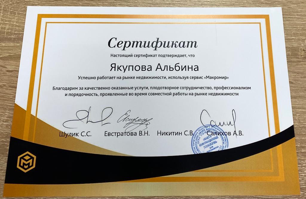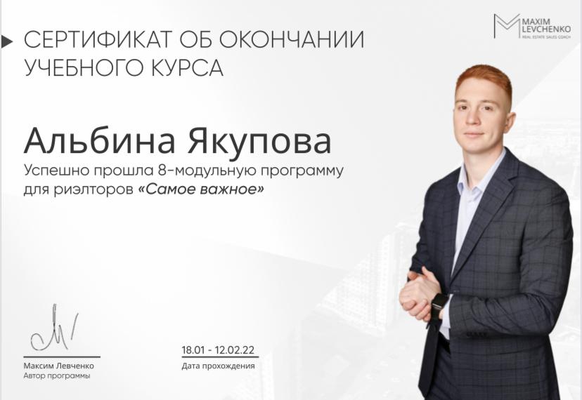 Хочу выразить благодарность Альбине Якуповой за проделанную работу. Она профессионал своего дела, тщательно проверяет все документы, отвечает на все вопросы, всегда на связи в любое время. Сопровождает на просмотрах и сделках. Очень ответственная, знает свое дело, ещё добрый и отзывчивый человек. Спасибо ей большое, успехов в делах и побольше сделок и благодарных клиентов. Рекомендую её как лучшего специалиста.