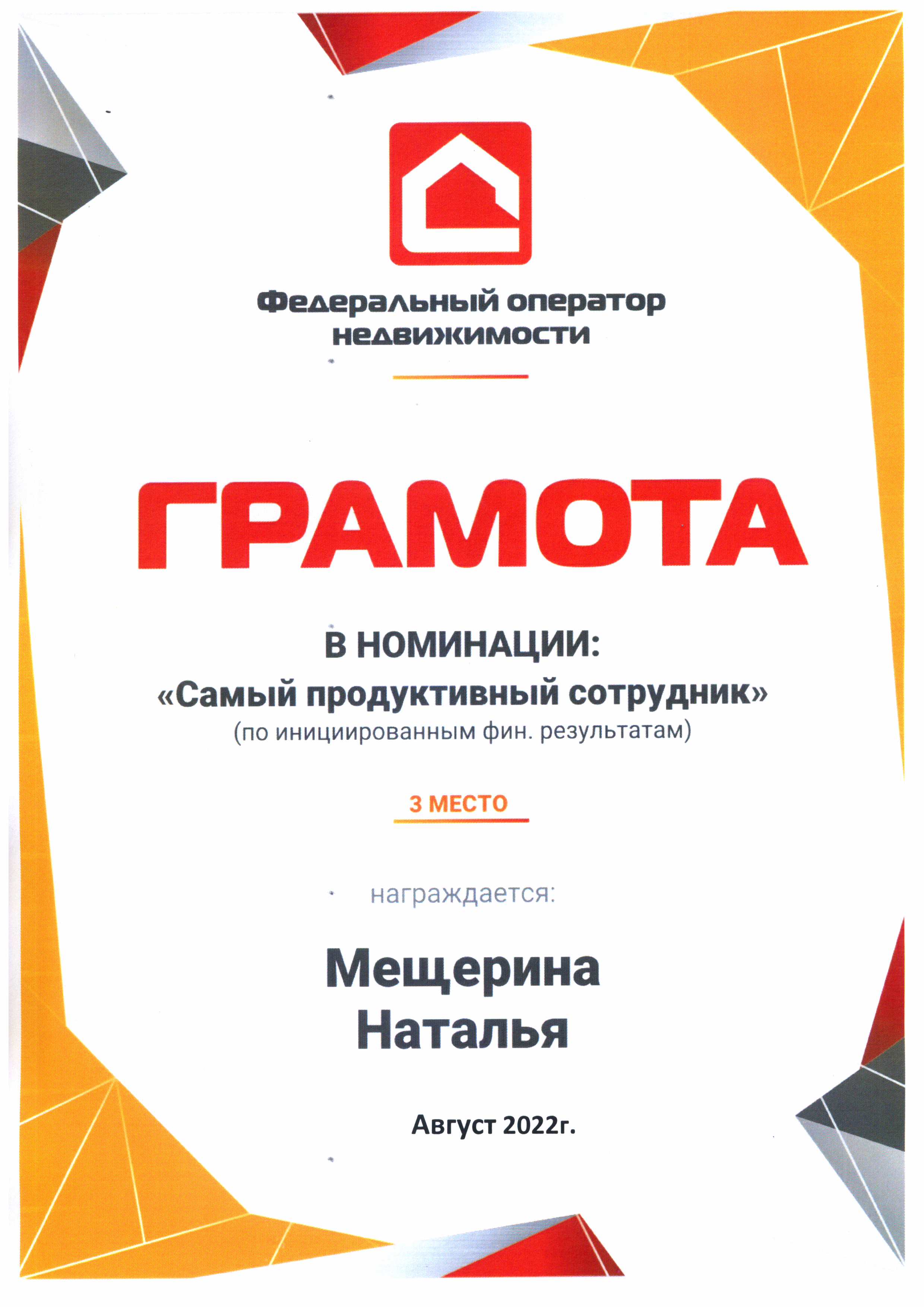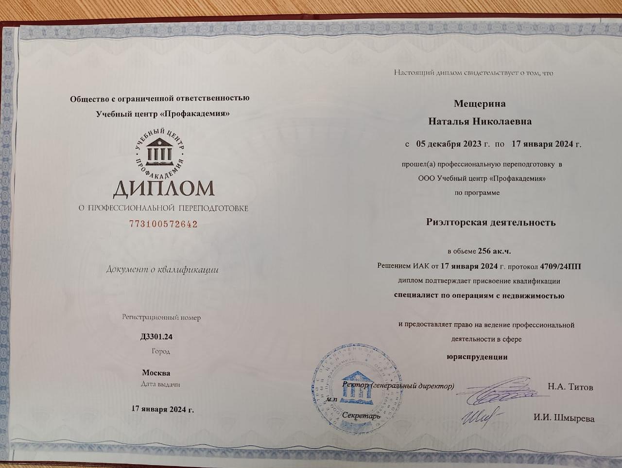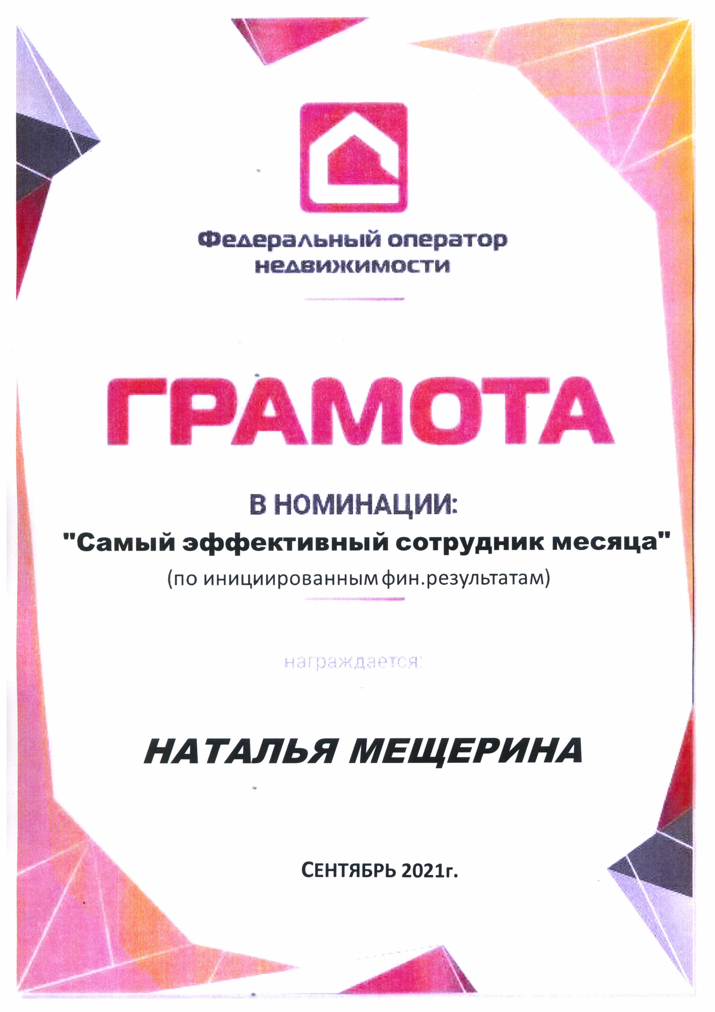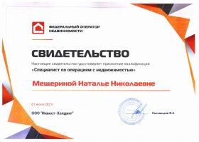 Здравствуйте! Работу над моей сделкой вела Мещерина Наталья! Хочу сказать огромное спасибо профессионализму Наталье. Всё прошло четко, гладко, быстро! До этого обращались к другому риелтору, но продать она так и не смогла или не хотела. Решили отказаться от услуг. Сами нашли покупателей всего за 7 дней и обратились для проведения сделки к Наталье. Благодаря ее опыту, чуткости с клиентами и профессионализму сделку оформили быстро и в короткий срок. Огромное спасибо! Теперь в моей записной книжке есть человек, с которым можно быстро и профессионально совершить сделки с любой недвижимостью!