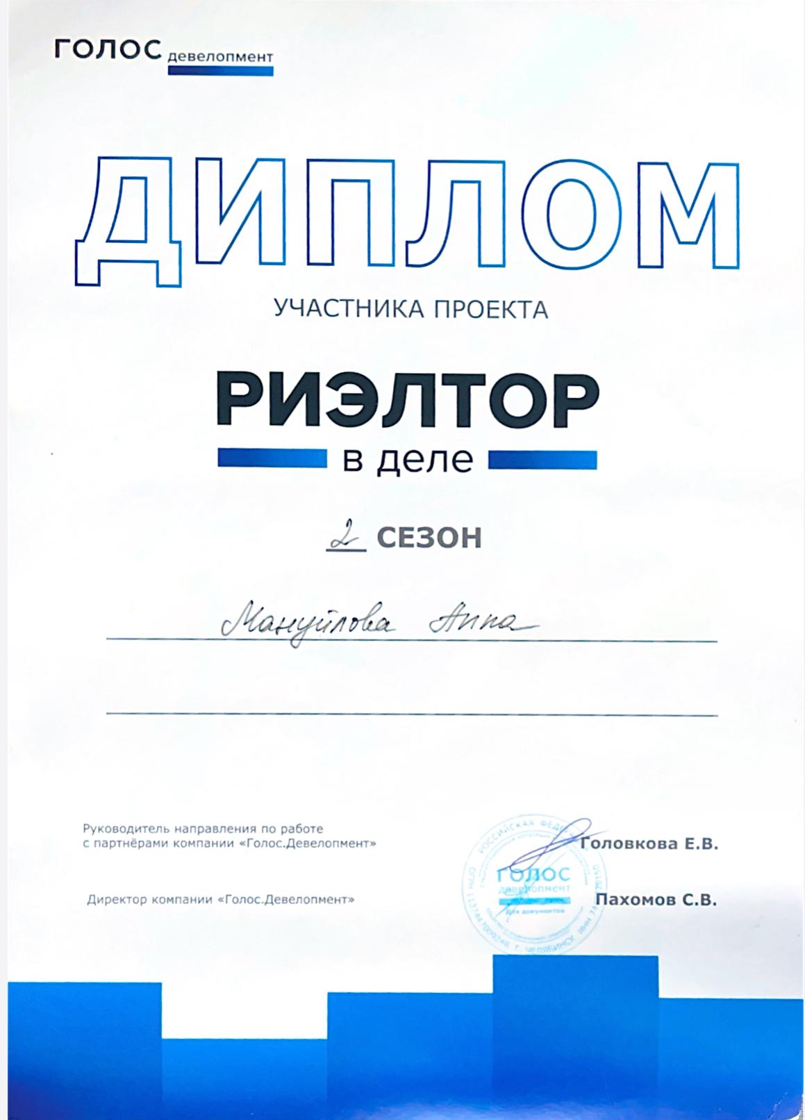 Хочу выразить благодарность Анне Мануйловой за помощь в продаже нашей квартиры и покупке новых двух. Сделки прошли отлично. Сначала было волнение, так как мы не представляли как можно одновременно продать и купить две квартиры, но Анна организовала весь процесс максимально профессионально, все моменты контролировала вплоть до передачи ключей. К тому же Анна продала нашу квартиру по выгодной для нас цене. Всем рекомендую этого риелтора!