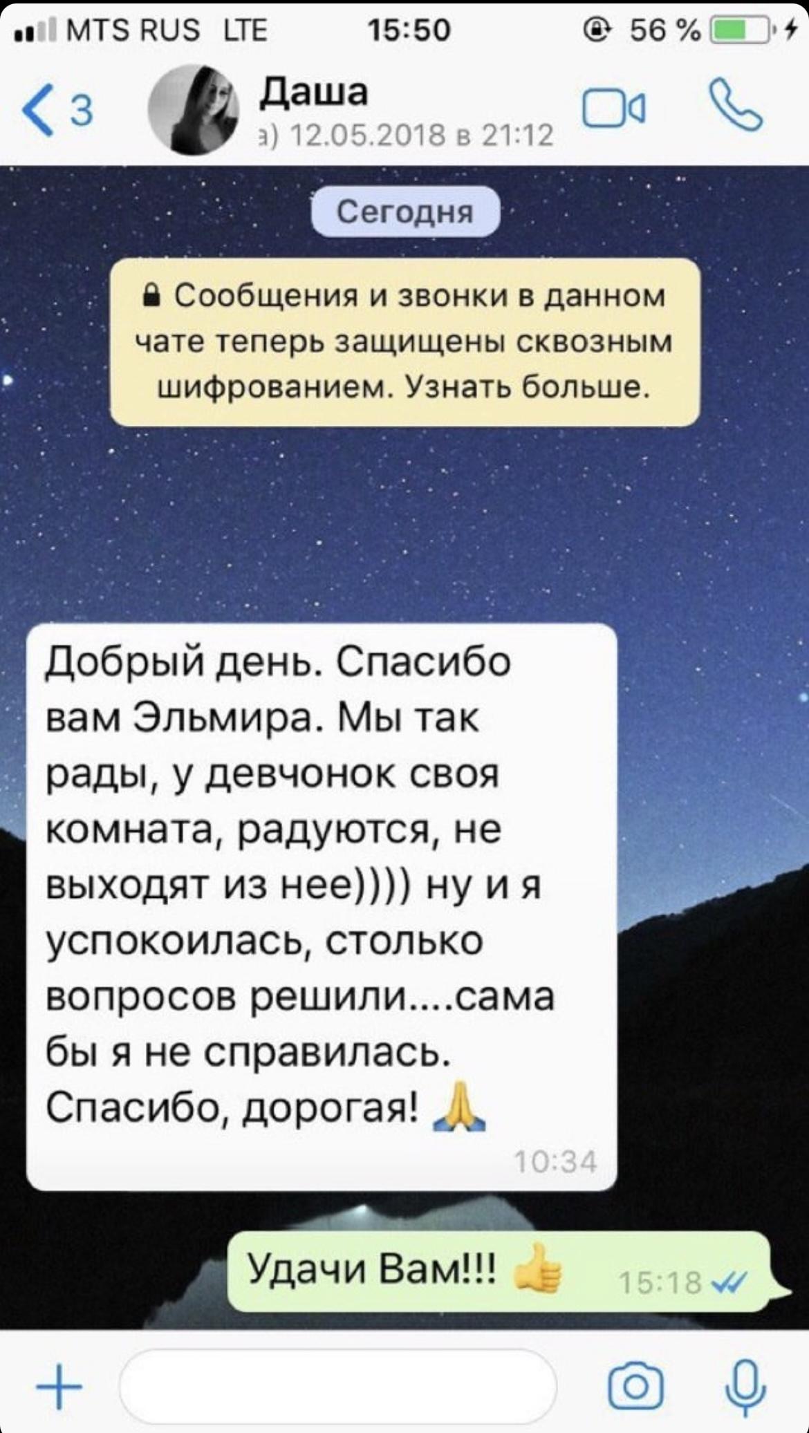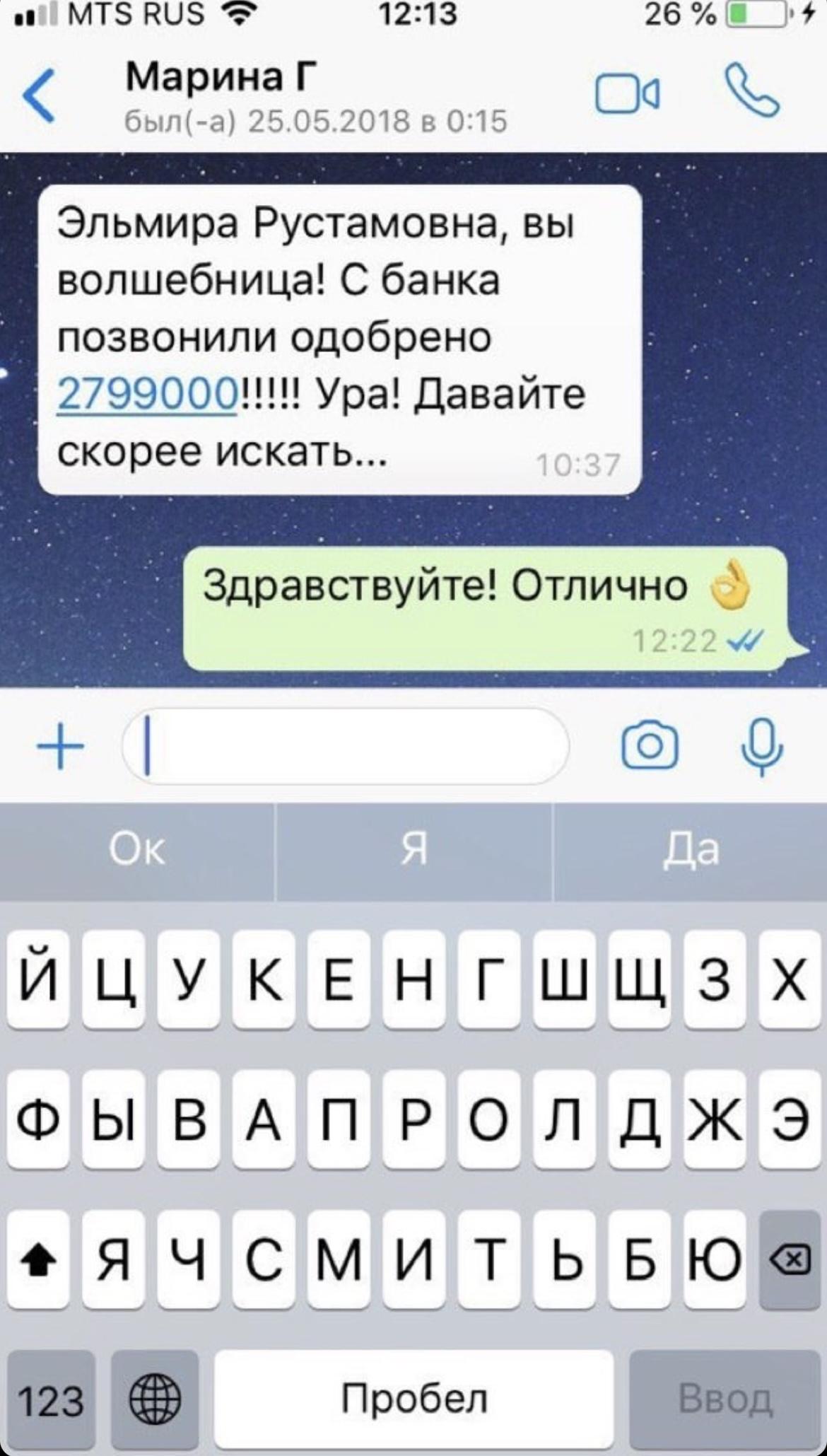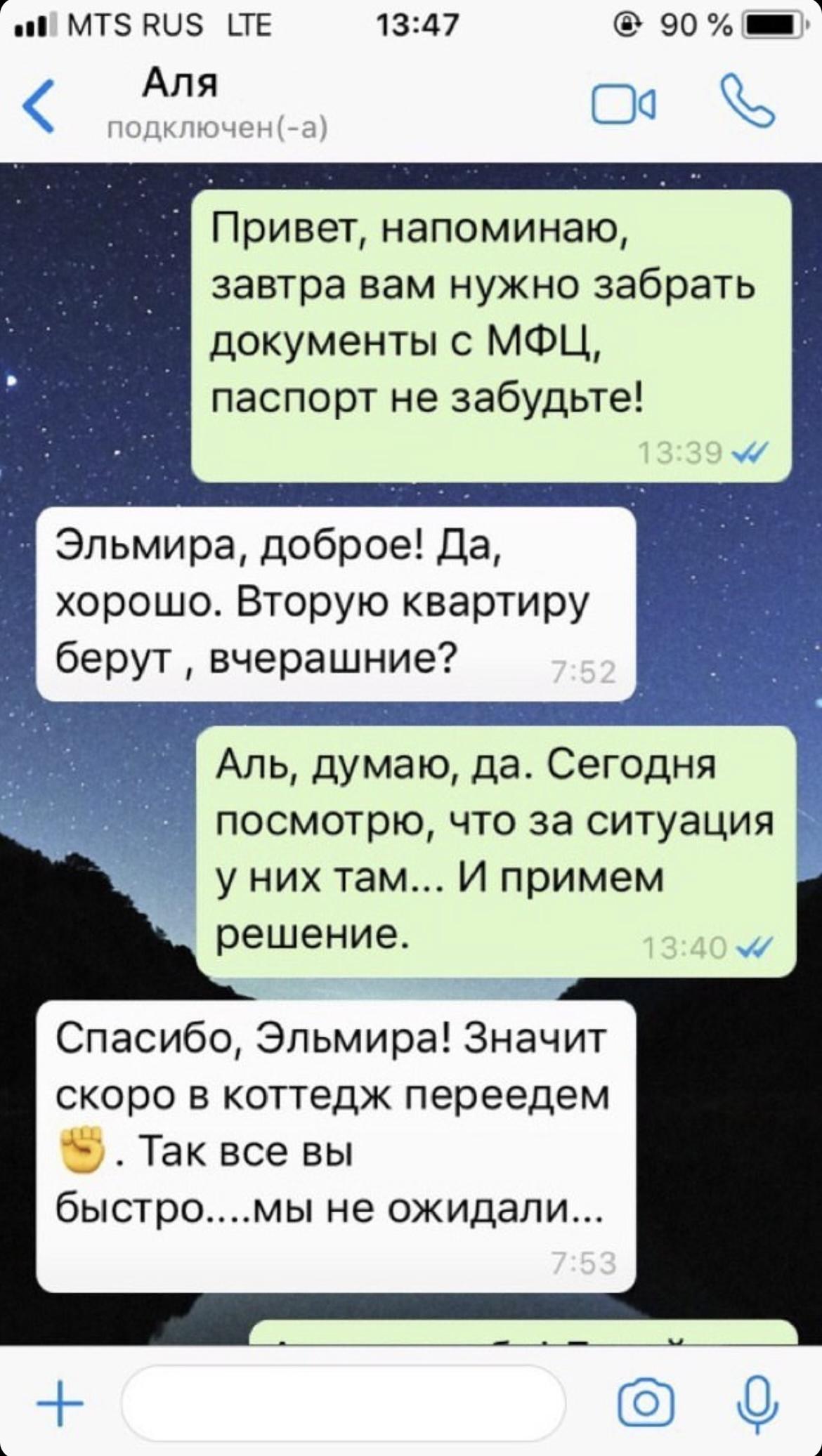 Я хочу выразить огромную благодарность Эльмире Рустамовне за исключительное внимание и заботу, с которыми она подошла к поиску квартиры для нас. Ее профессионализм, опыт и чуткость были просто выше всяких похвал. Она подобрала нам идеальное жилье, учитывая все наши пожелания, словно искала для себя. Спасибо ей за теплоту и человечность в общении, за терпение и понимание. Работать с ней было настоящим удовольствием. Я рекомендую этого риелтора всем, кто ценит профессионализм и душевное отношение к своей работе.