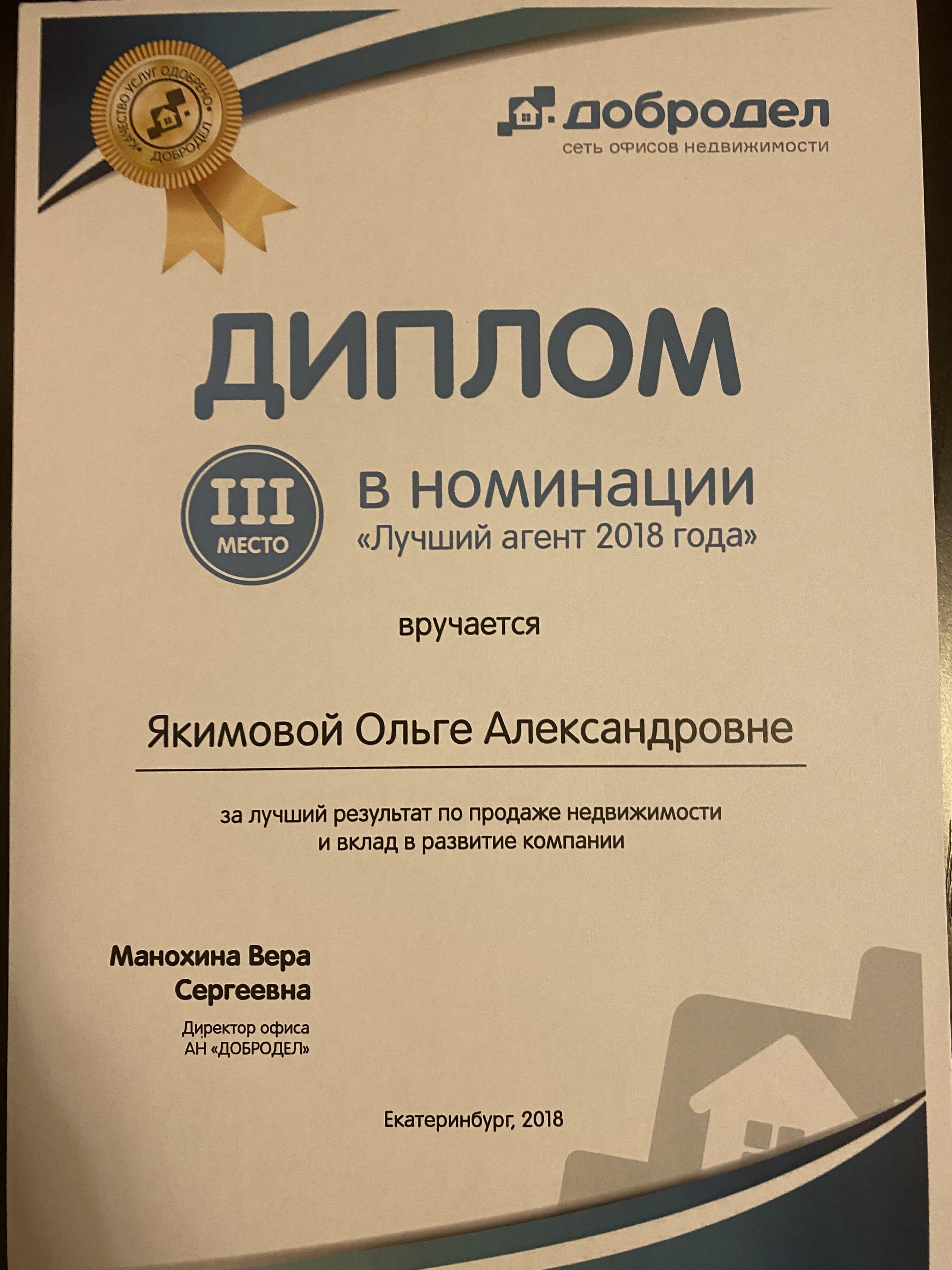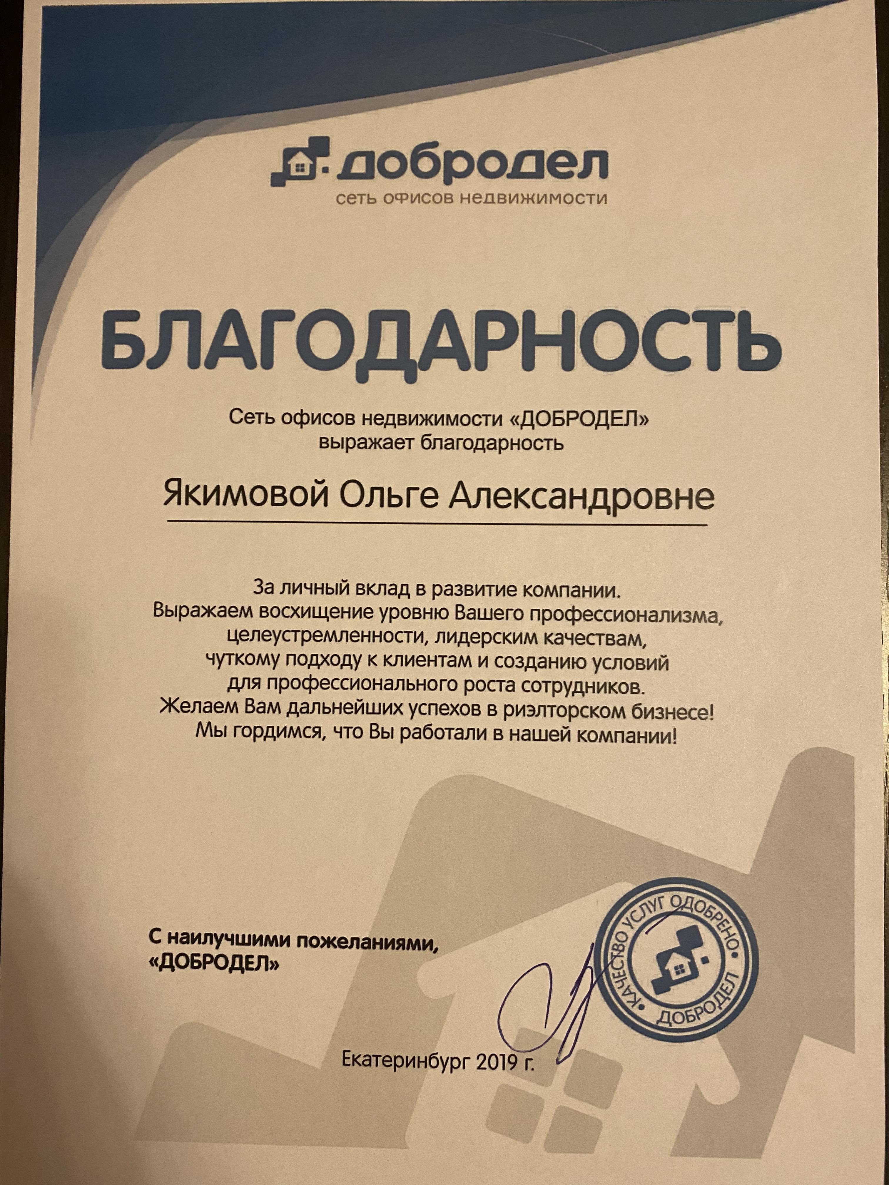 Выражаю благодарность Якимовой Ольге Александровне, за сотрудничество. Профессионал своего дела с высшей буквы! Продавали квартиру, в голове были свои намеченные цели и мечты, но мы не знали сможем ли все это реализовать, благодаря Ольге все случилось. Квартира продана выше наших ожиданий, как она смогла это сделать..?? по всей видимости так могут только настоящие Профи: четко, быстро, никакой воды. Всегда на связи, все у нее всегда под контролем. Буду всем рекомендовать. Успехов Вам и процветания!