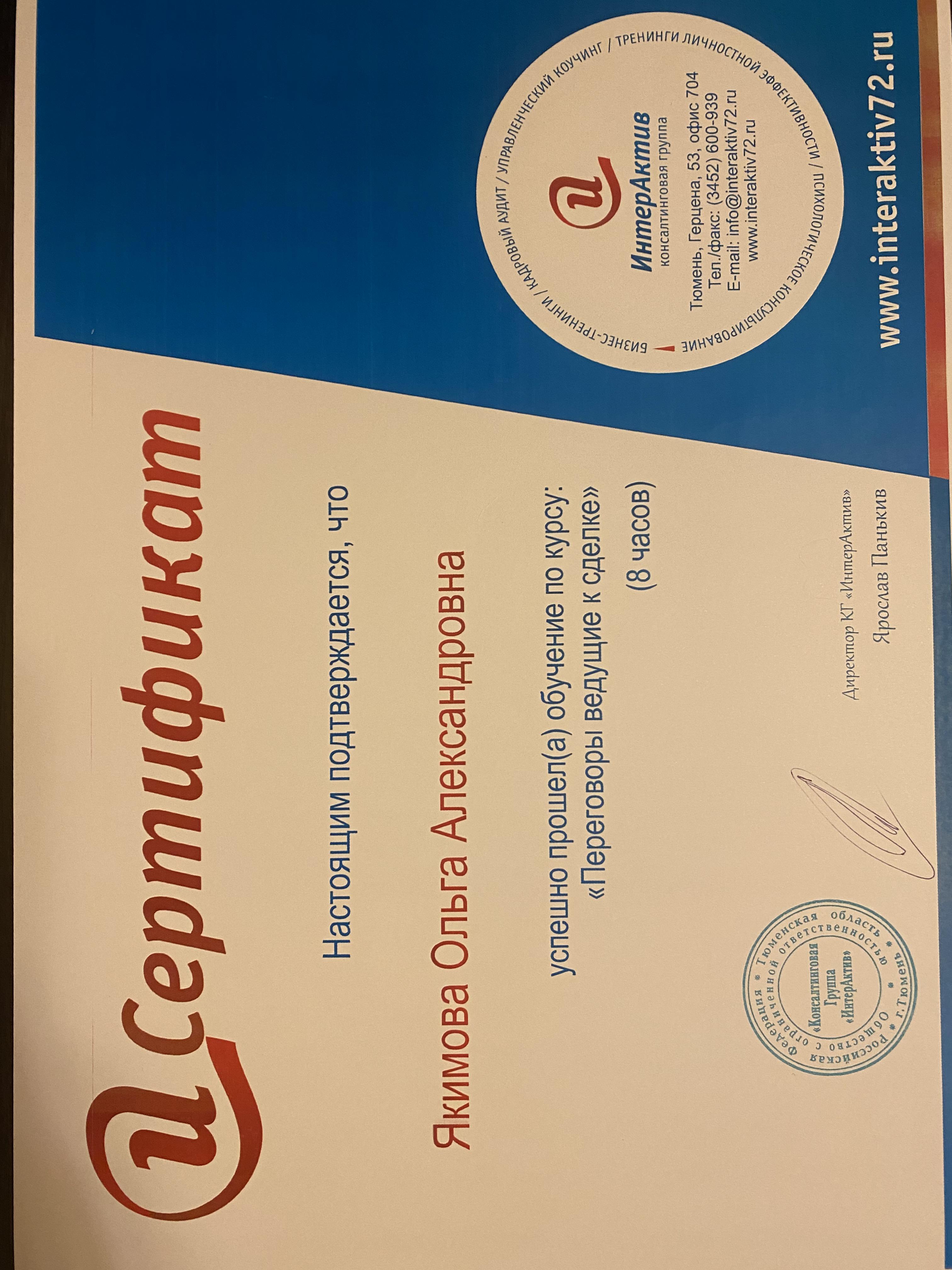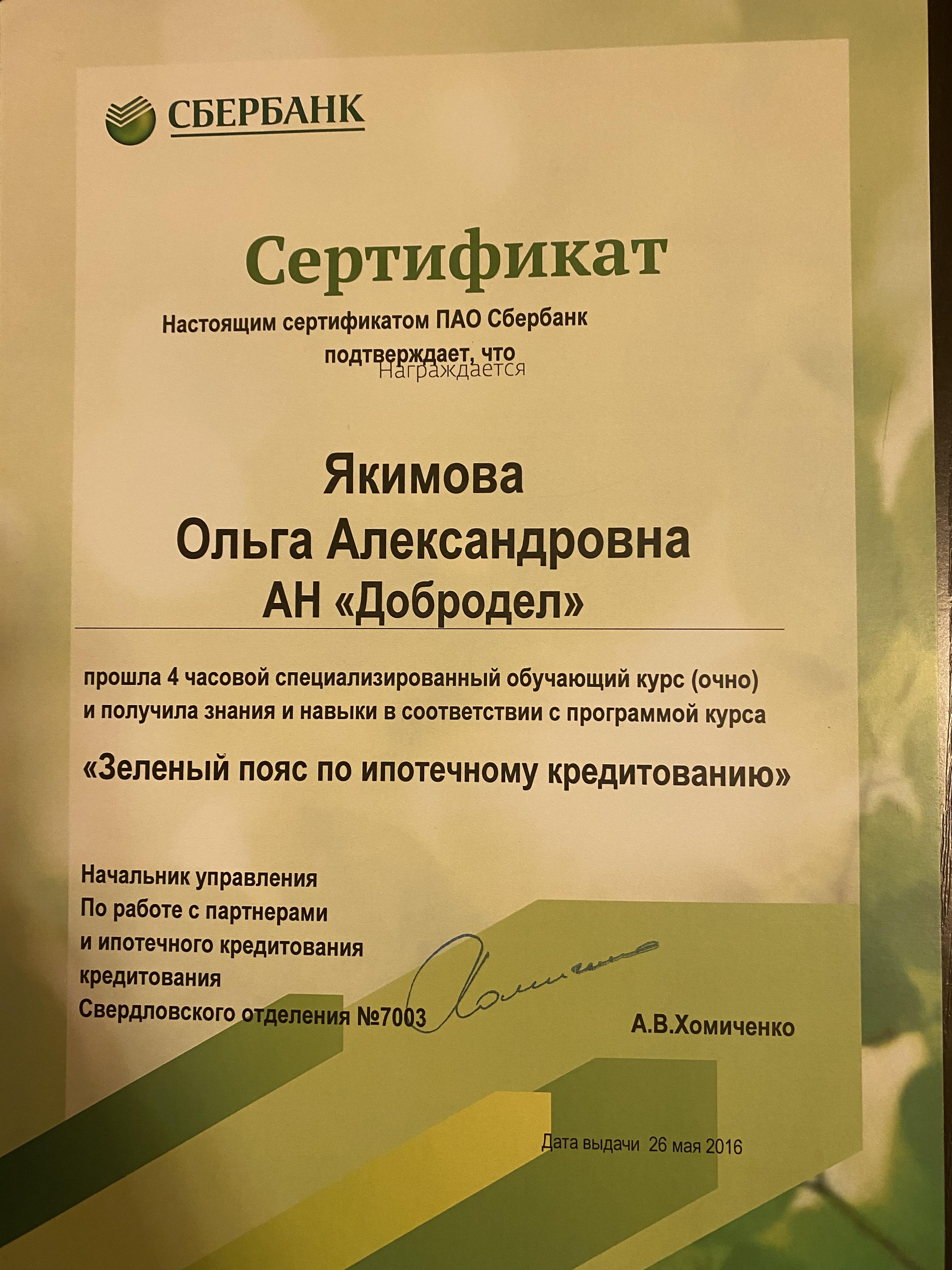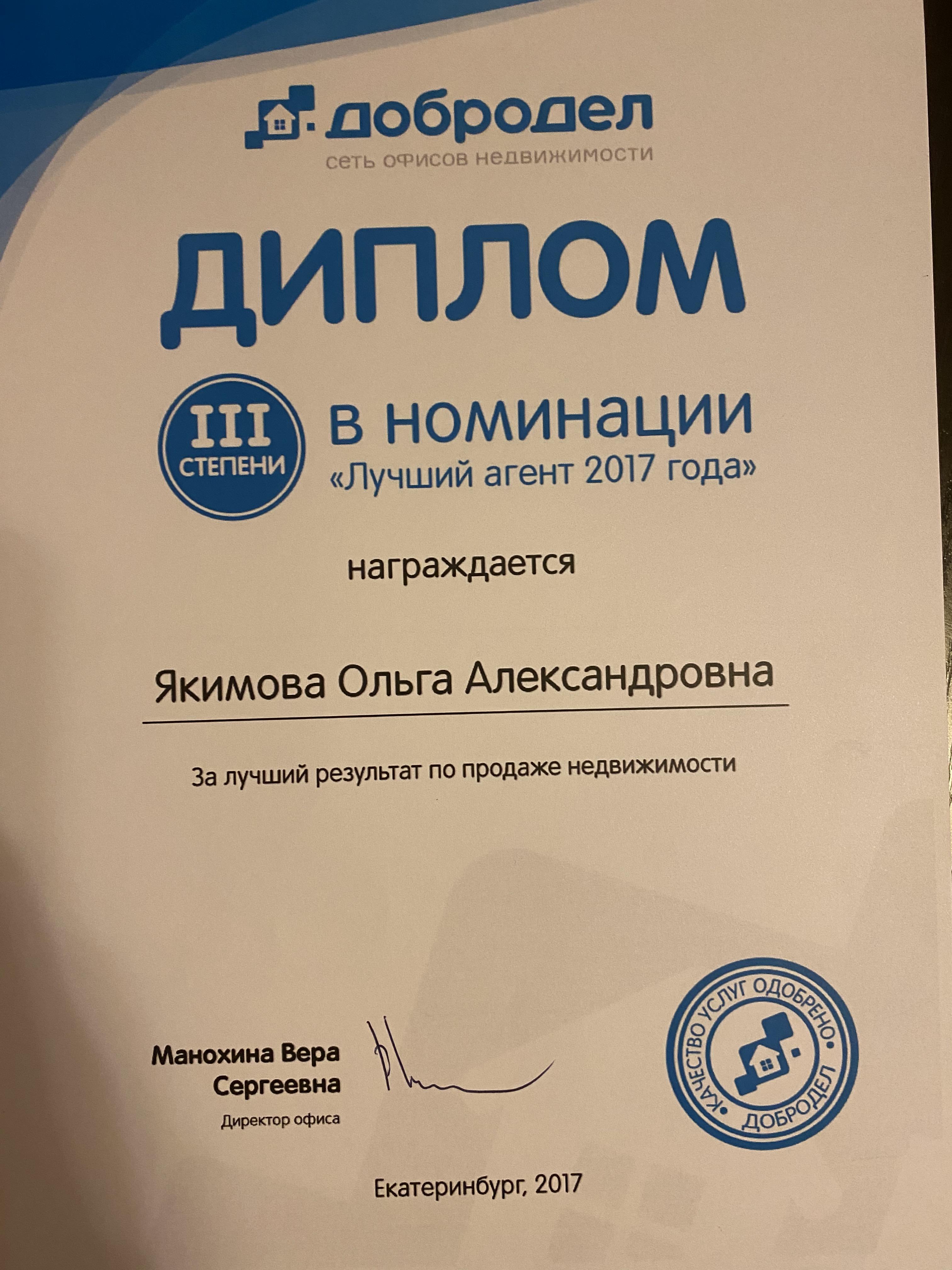 Добрый день! Хочу выразить благодарность Якимовой Ольге за продажу моей квартиры. В течении одной недели она нашла покупателя на мою квартиру, сроки просто превзошли все мои ожидания)) С первого дня общения, я понимала, что общаюсь с человеком своего дела, сильным, компетентным профессионалом!! На сделку вышли очень быстро. Спасибо еще раз! Буду всем друзьям и знакомым рекомендовать!