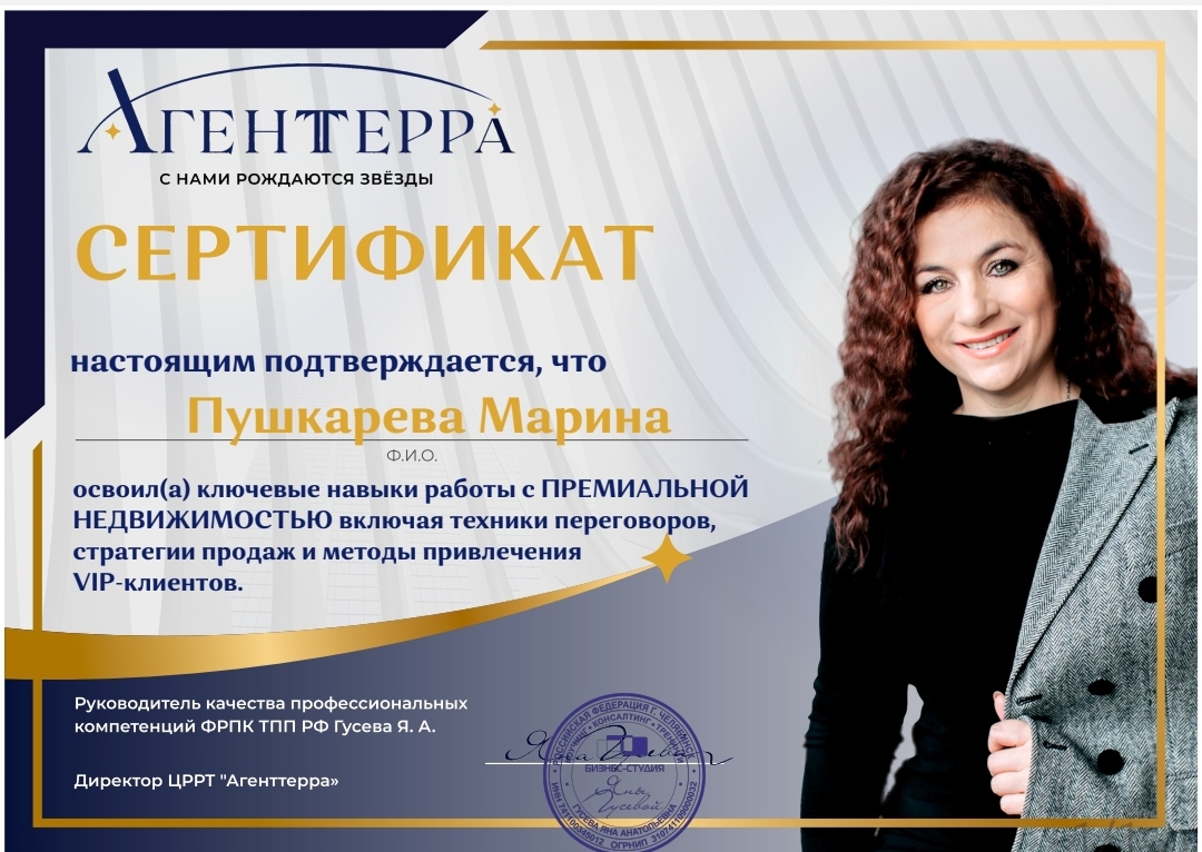 Марина Пушкарева настоящий профессионал своего дела !безупречная организация работы, надежность,юридическая грамотность. Обходителена ,сдержана, честена и пунктуалена. Всегда все подробно объяснит и расскажет. Очень благодарена Марине за оказанную помощь в совершении сделок!
